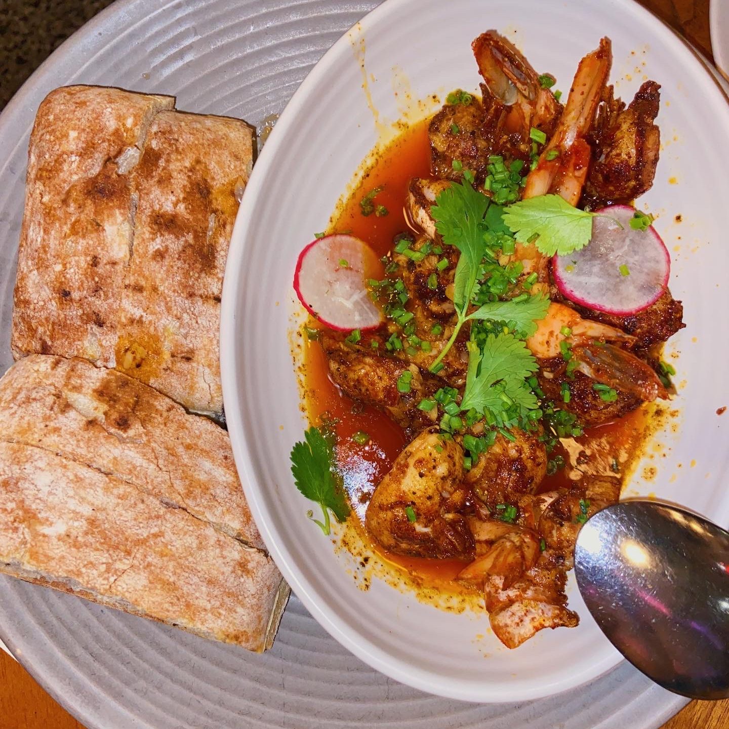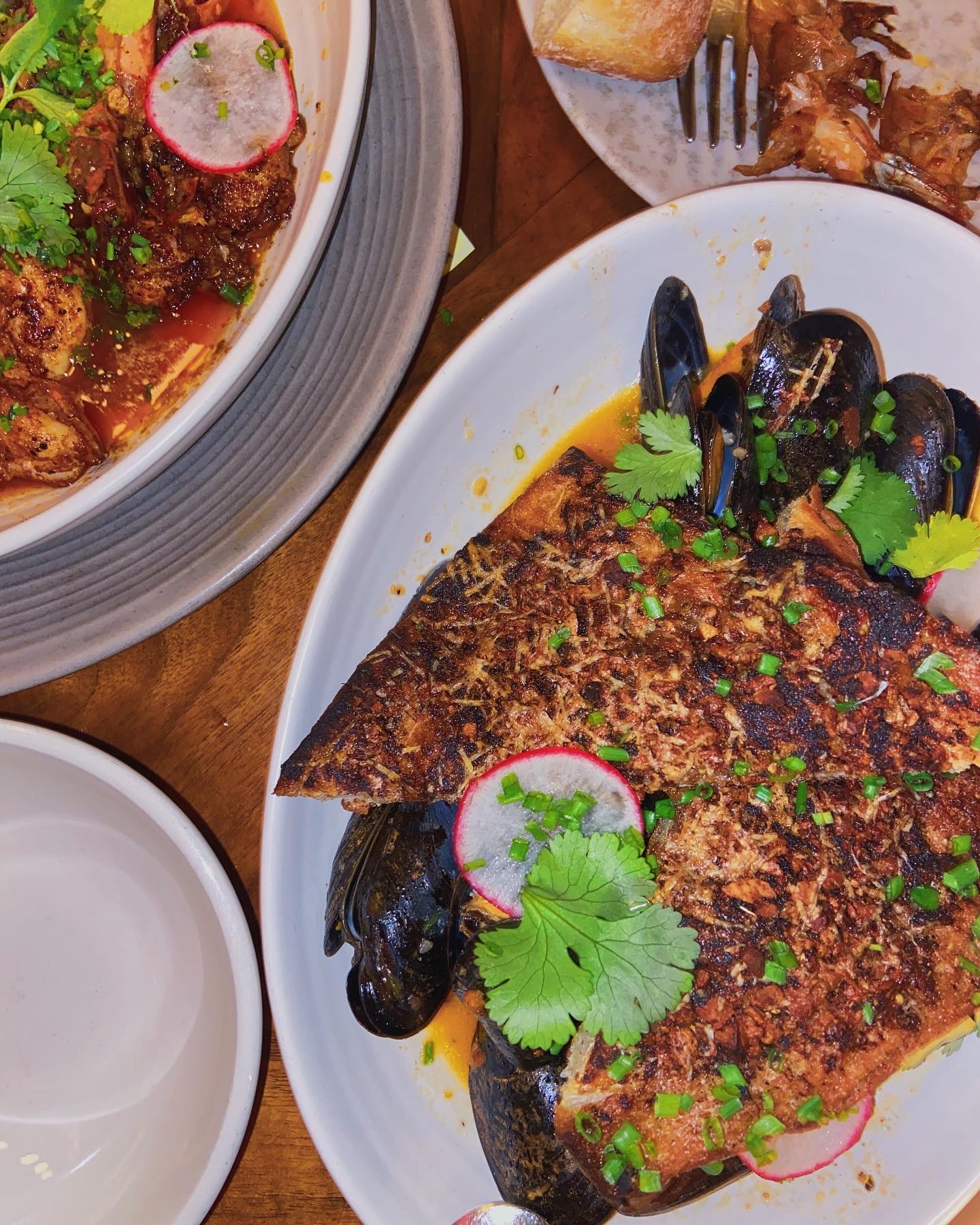 After the oysters, we split three of the smaller plates- the snapper collars, mussels and picadillo, and the gambas al ajillo. The gambas are a mainstay on this rotating menu, which keeps with what’s in season so that you will always get the freshest seafoods and produce, with everything else being new territory. The gambas are done in this beautiful garlic and lemon broth that you will find yourself sopping up with bread long after the shrimp are gone. It is easily the star of the show every visit and the dish I recommend the most. The mussels were a nice treat in a super unique broth that was part meaty and part salsa verde almost. Compared to your traditional broths that get paired with mussels, this was an absolute flavor explosion, and truly unlike any broth I had ever had. Finally, the dark-horse. Red snapper is likely my favorite fish, and so when I saw the collars were being served grilled, I was intruiged. For those who do not know (like myself, as I googled in the restaurant,) a collar is the part right behind the head of the fish, which is typically scrapped, but contains some of the sweetest meat on the fish. You can get it at your fish monger’s stand usually for a really great price, and it truly does have some good meat on there. Enough with the history lesson though, let me tell you about this delight. With a cilantro and basil sauce as well as what seemed like a chile oil, this was such a bright and refreshing dish that quite literally made me stop in my tracks. I hadn’t expected to love this dish that much. It was such a great addition to the meal which was heavy on garlicky flavors (intentionally, because I love garlic,) as it immediately lightened the palette. This is a must-try dish, seriously.
