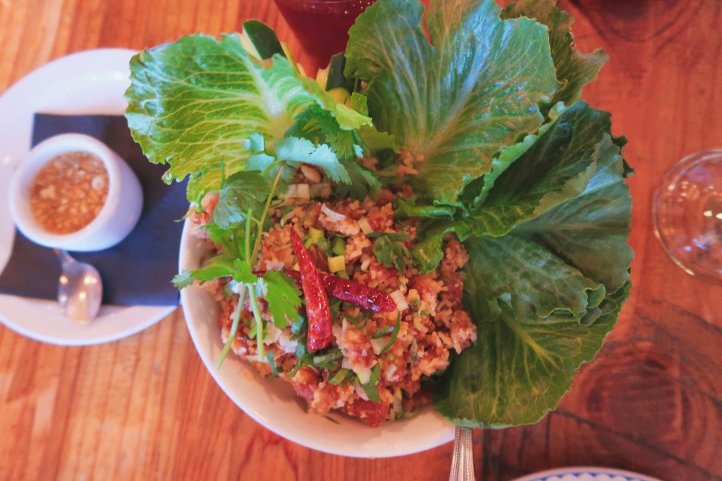 The space was nice and dim, smaller, and felt private. It was nice, just a relaxed spot where I didn’t feel I had to be too dressed up to enjoy, which I really appreciated. Our server was super prompt and very informative, telling us all about Laos. Quick little culinary lesson: Laos is a small country very close to Thailand, so you see a lot of overlap in their dishes, but some of the preparation is different.