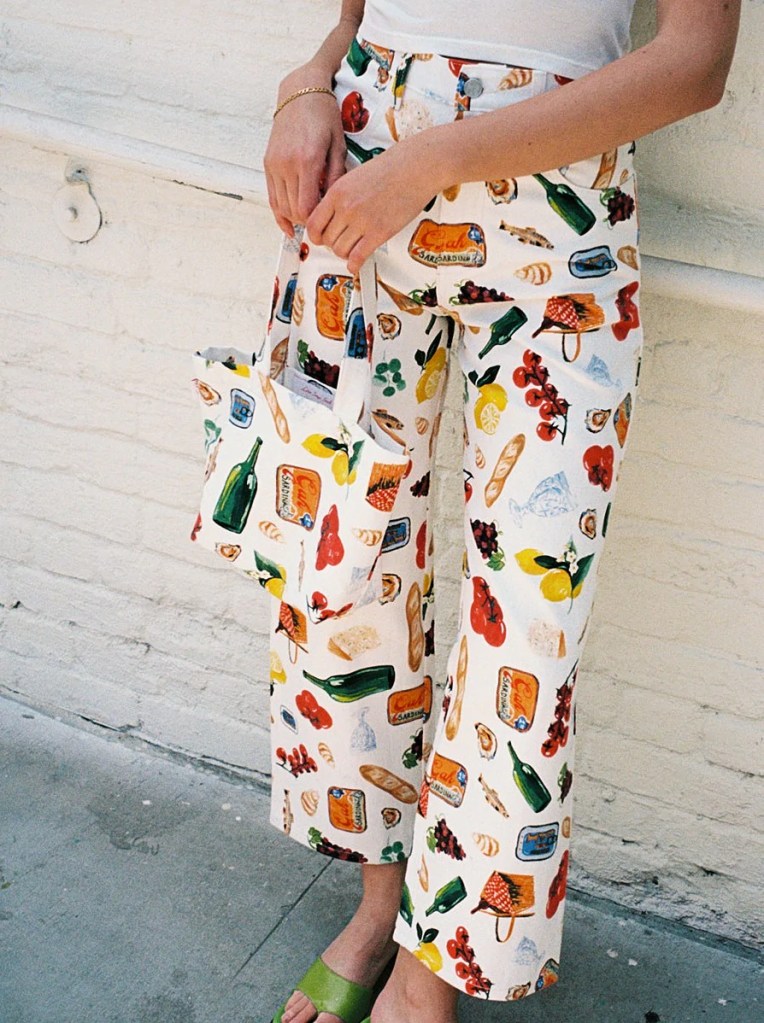Want to feel like you’re abroad in Europe in the summertime but it’s winter and you’re stuck at home? Well, bring a slice of Europe to you with these jeans. I love a funky pair of pants to help diversify outfits every now and again, and these are the ideal pair in my opinion. I love that these are straight leg, they’re white at the base and will pair with lots, and more than that, I love that we have some tinned fish, baguettes, and oysters getting the representation they deserve.